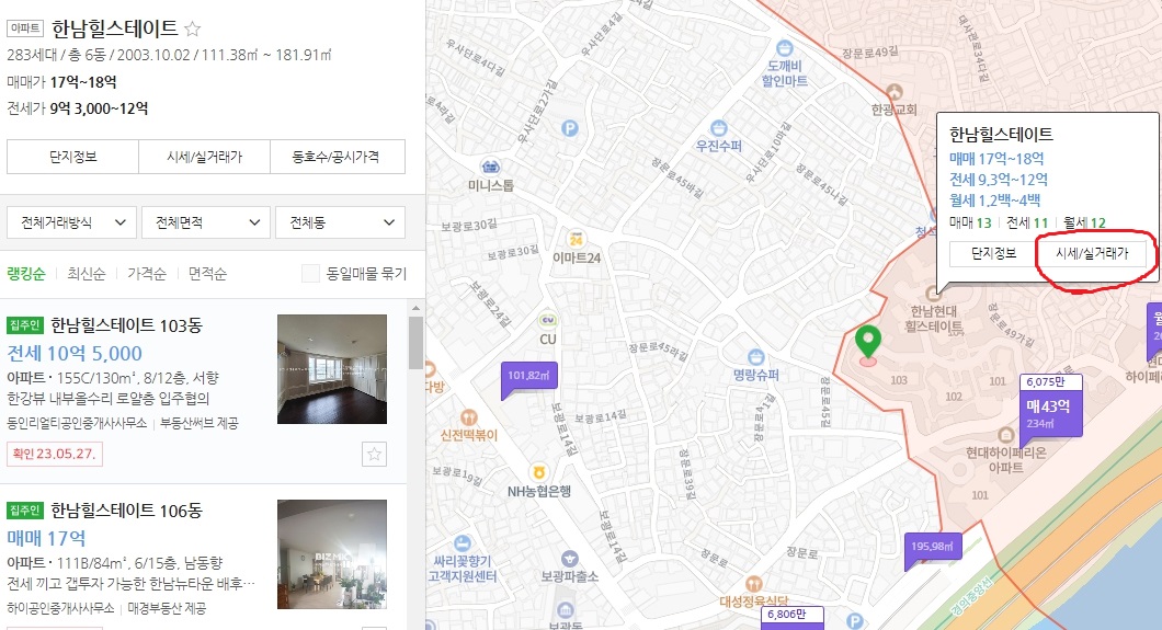 ③ 상세 페이지에서 실거래가를 확인한다(오른쪽)
