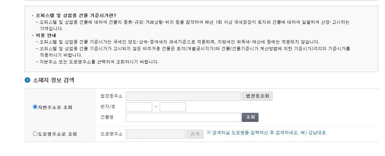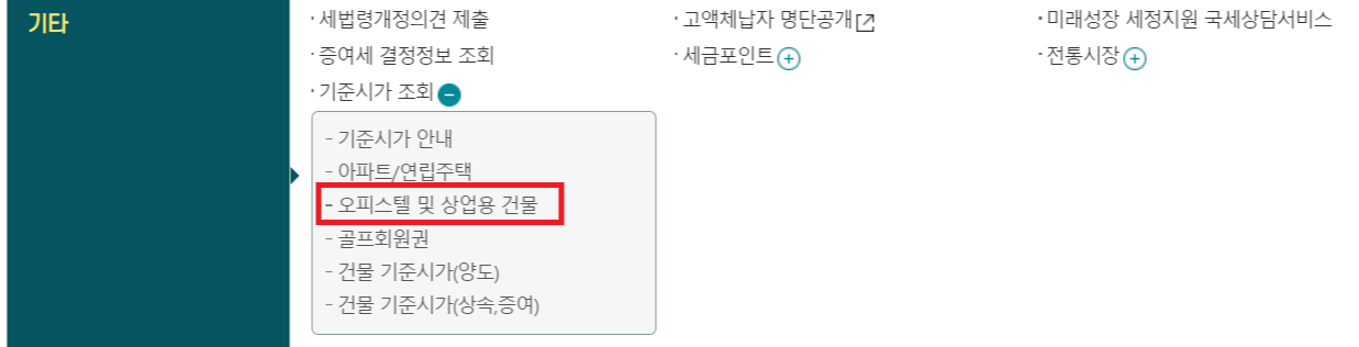 맨 하단의, 기준시가 조회 버튼 클릭 후 나오는 탭에서 "오피스텔 및 상업용 건물" 클릭