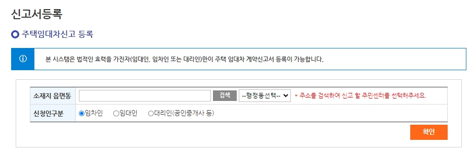 2) 신고서 등록 - 신청하려는 부동산의 주소 및 신청자(임대인 or 임차인) 선택